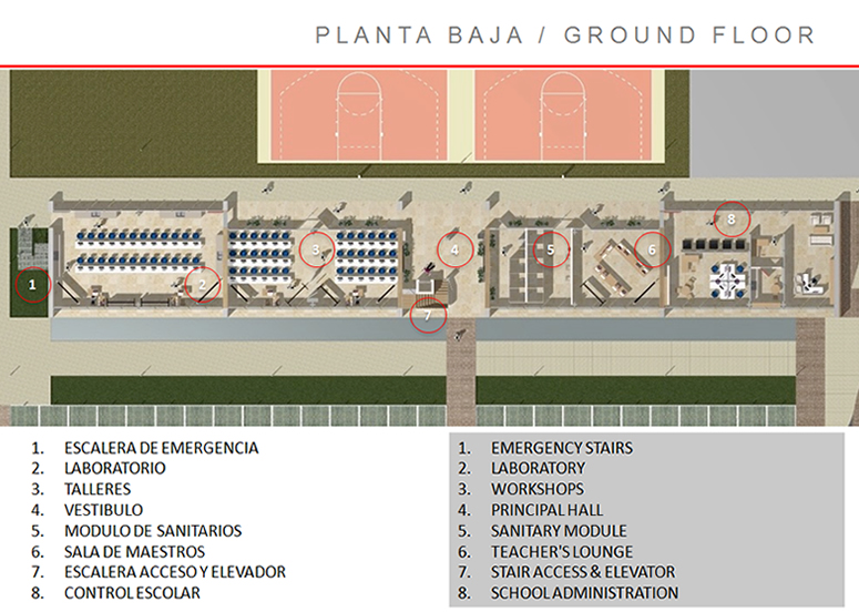 2 laboratorios, 2 Talleres (Especialidad por definir), Área administrativa, Sala de maestros, Oficina de servicios escolares, Zona de servicios sanitarios por cada nivel.
