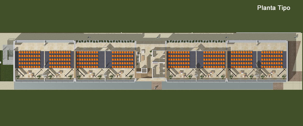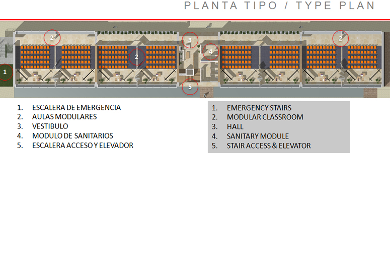 Teaching, versatile classes The basic module is to receive up to 45 people and has movable panels that can integrate 2 classrooms in one housing a total of up to 90 people. We have 22 modules, 2 laboratories, 2 Workshops (Specialty to be defined), Administrative area, Teacher's lounge, Office of School Services, Area of sanitary services for each level.
